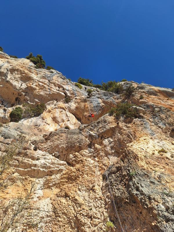 Grand beau. Doudoune le temps des rappels (il gèle le matin) et dès 16h lorsque le soleil passe derrière les falaises. Sinon grimpe en teeshirt. Pas d'autres cordées dans la zone, quelques touristes au belvédère, une armada de Vautours fauves longent la paroi au gré des courants thermiques.