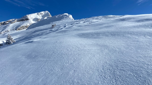 Belle couche de neige en altitude dont la dernière chute semblerait être tombée sans vent. 30 à 40 cm de neige légère très agréable à skier.