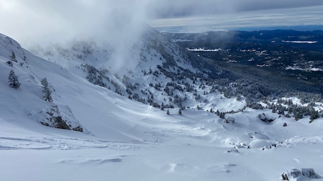 Beau temps froid, -4° au départ, juste au dessus de la mer de nuage donc ciel clair avec parfois quelques remontées nuageuses venant du sud. Léger vent de SW en altitude et surtout près de crêtes.