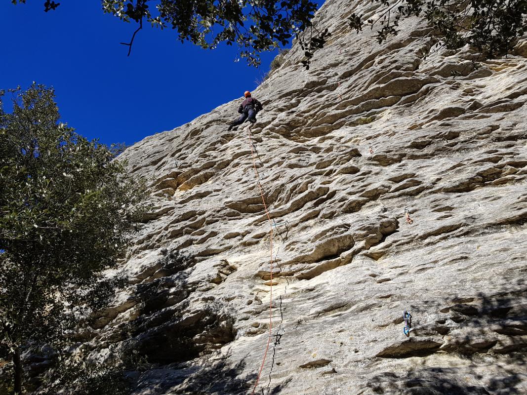 Lundi dernier jour, direction le secteur "GVB" (paradis du 6 d'après le topo) pour ceux qui veulent tâter la dalle à trous, avec deux cordées qui s'arrêtent à "la Béda" pour des petites grandes voies. L'ensemble du groupe se retrouve au secteur "Mur à Zappa" pour finir le séjour sur des dalles bien joueuses.