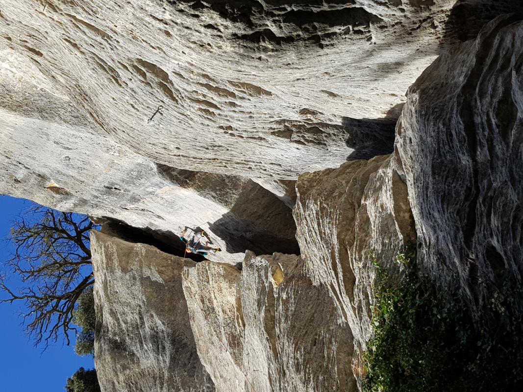 Le Dimanche, 2nd jour, commence par de la pluie. Mais quelques gouttes n'entameront pas la motivation du groupe, en longeant les falaises nous repérons des secteurs épargnés par l'humidité ("Fakir" et "Excalibur"). Puis dans l'après-midi une partie du groupe migre vers Salinas et une autre pose des moulinettes grâce à un escalier taillé dans la roche pour s'essayer au 7ème degré (sous le regard d'un certain "bombé bleu").