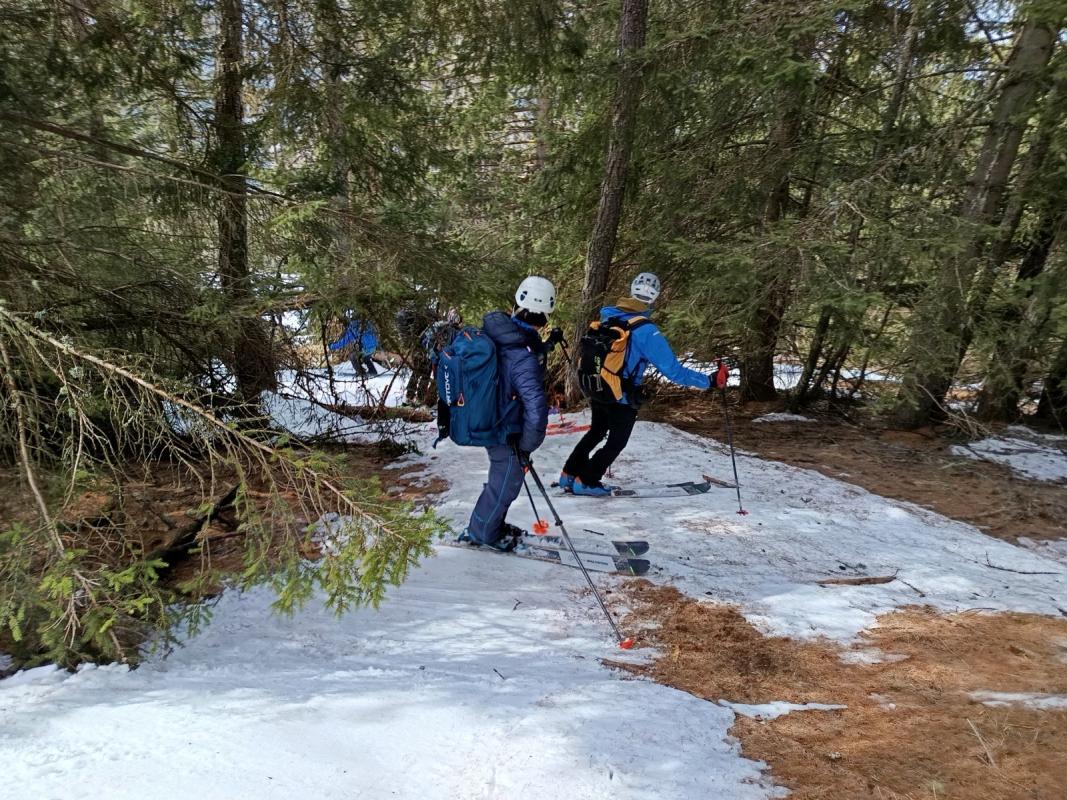 Enneigement continu mais c'est juste dans le bas et en forêt. Heureusement que la piste est là. La descente côté ouest est bien skiante avec seulement un dizaine de traces contrairement à l'itinéraire de montée complètement dévasté.