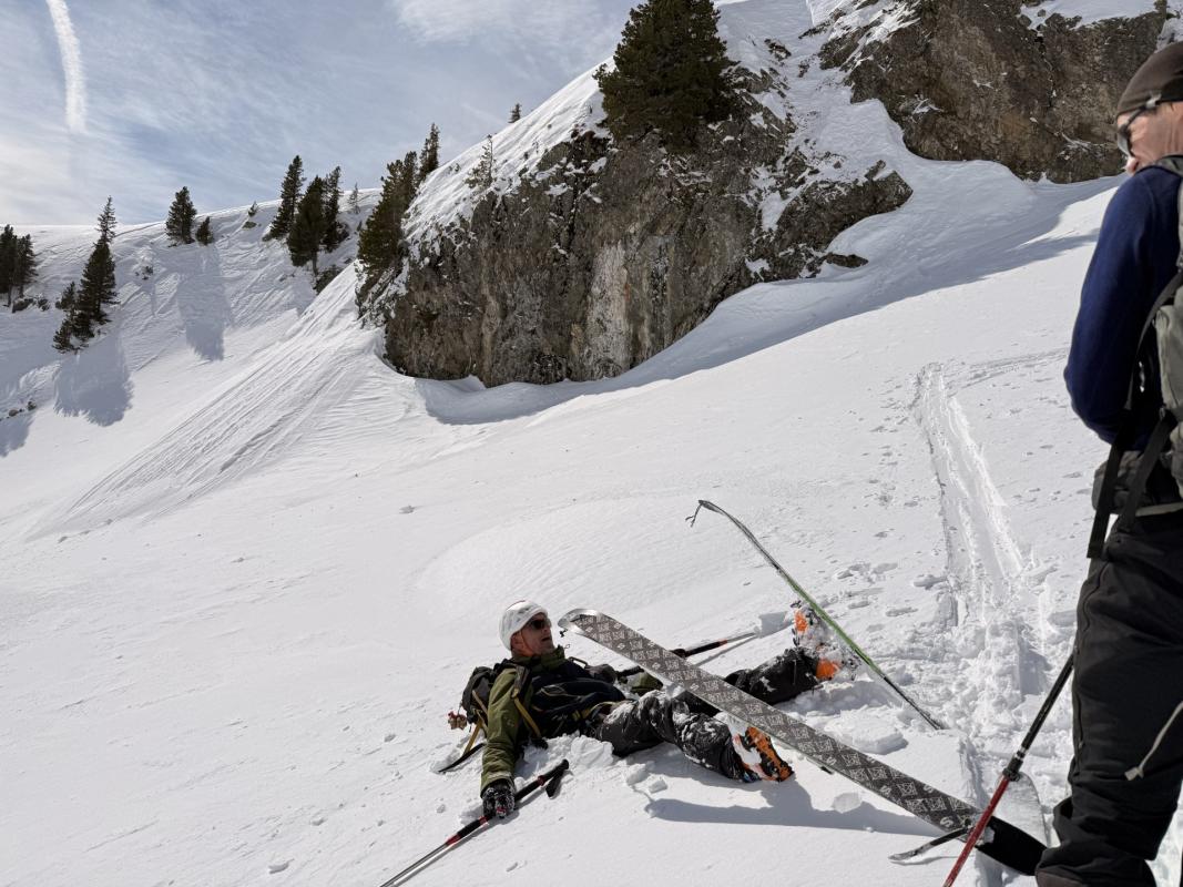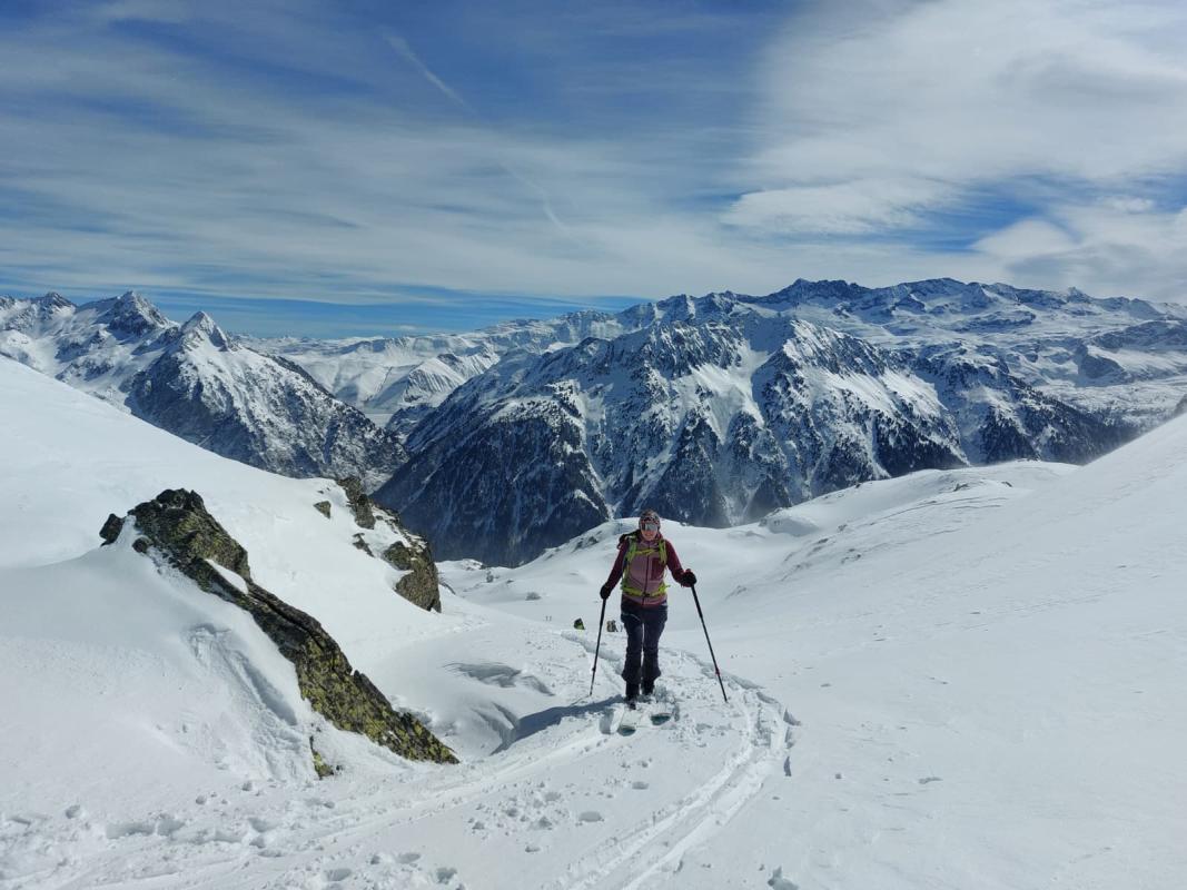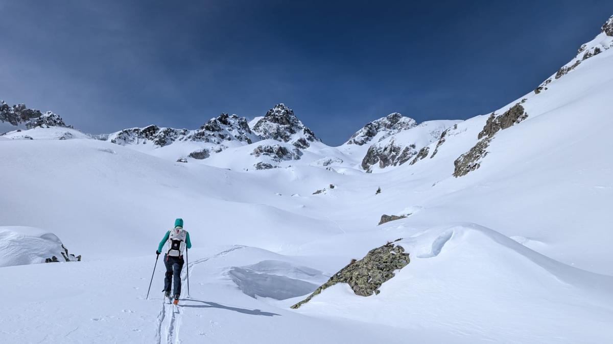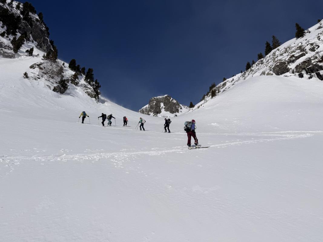 Une fois sortie de la forêt on décide de ne pas suivre la trace pour éviter la foule. Du coup on tracera dans une neige légèrement plaqué mais pas désagréable qui annonce une bonne descente. On prend un peu de distance dans les pentes les plus raide du goulet pour éviter de faire partir les 10cm de neige plaquée, mais rien de bien alarmant !