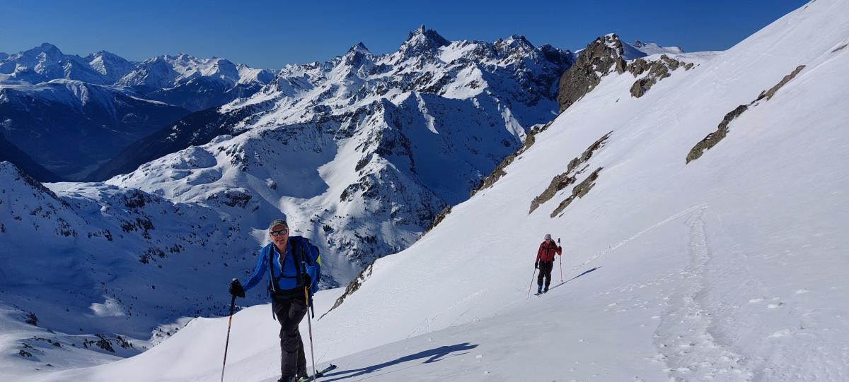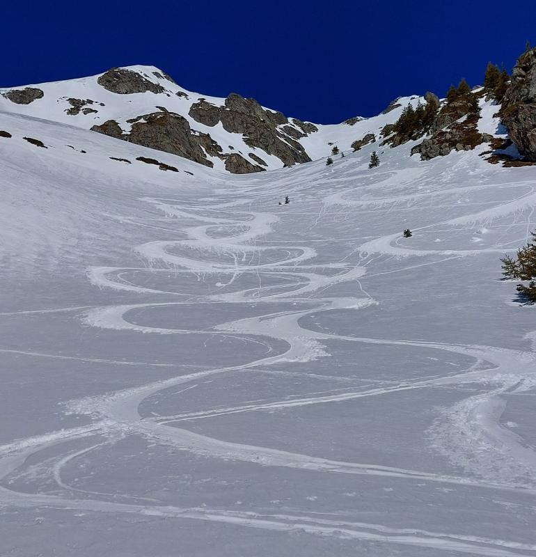 Départ matinal pour une sortie rondement menée, une première descente jusqu’au lac du Vénétier excellente donc on remonte pour un deuxième tour, un peu plus mou bien sûr mais toujours du bon ski, ça chauffe bien sur ce versant sud-est ! Ensuite petite remontée pour venir chercher les belles pentes beaucoup moins tracées sous le Jas des Lièvres, pique-nique au refuge et la bière au Convivial.