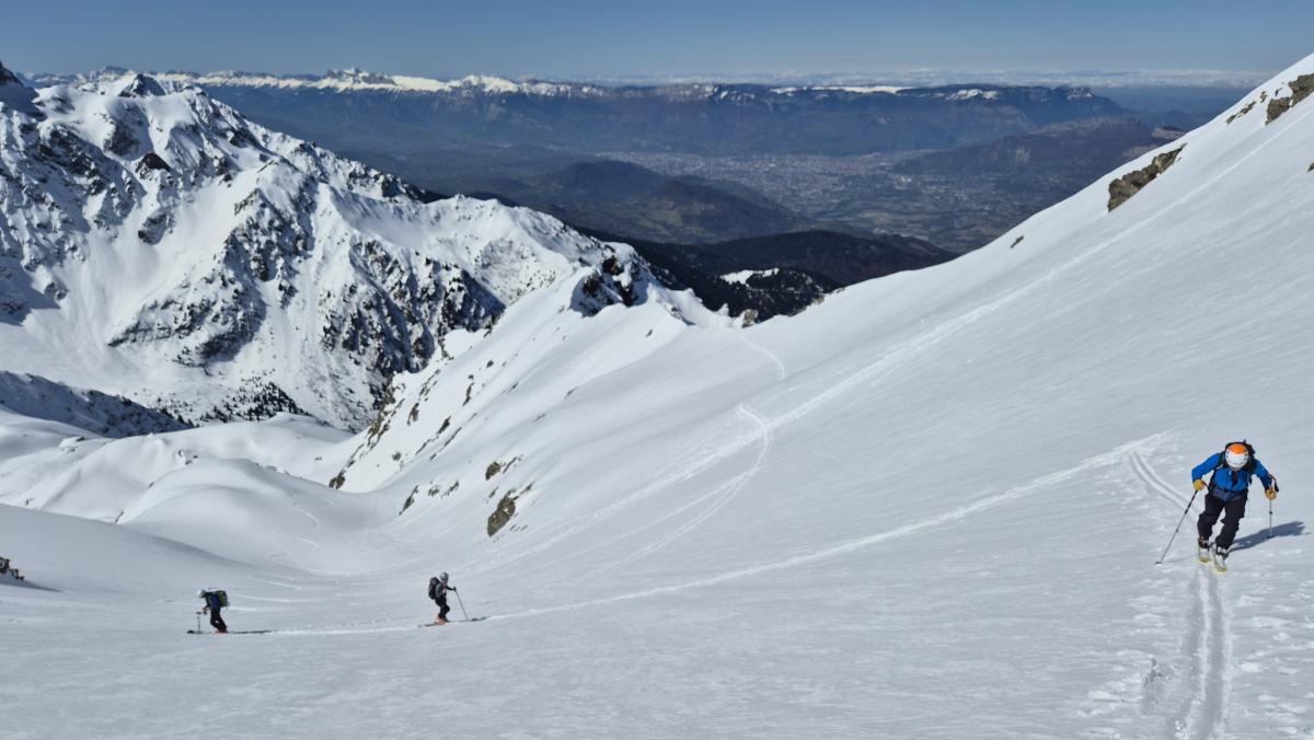 Petit groupe, et il ne fallait pas être plus nombreux pour cette randonnée exigente. Nombreuses manips (dépeautage, crampons, repeautage). On a tracé à pied depuis le pied du coulor Ouest pour passer dans les vires (exposition) et pentes raides. Le neige est meuble, on enfonce un peu, merci à tous pour le tour de role au tracage.