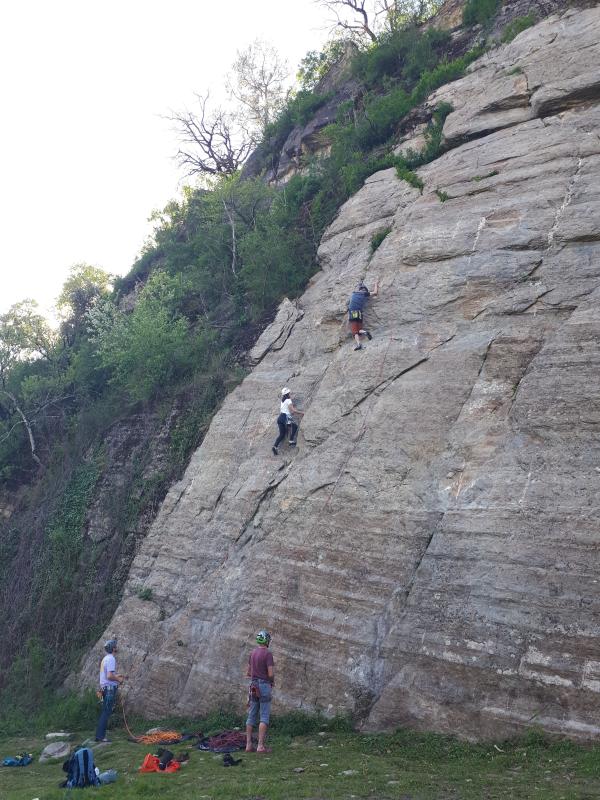 Nous avons d'abord révisé la manip de haute voie grâce au relai pédagogique installé au pied de la falaise. Gabrielle a commencé par grimper la Rampe des Commères. Puis Pierre et Gabrielle ont grimpé Arbréoplane. La voie commence par une section en dalle avant d'atteindre une écaille. Les difficultés se concentrent principalement sur la première partie en dalle de la voie. Ensuite, ils ont grimpé la voie d'à côté, Hugo est lent, qui comme sa voisine, commence par une section en dalle mais d'un niveau un peu au-dessus. Une dégaine rallongeable est à prévoir dans la partie haute de la voie (point à clipper un peu décalé à droite de la ligne). Puis, Pierre a grimpé Lézard Hard (6b) à vue. Enfin, l'après-midi s'est terminé par l'escalade de Lion hell road.