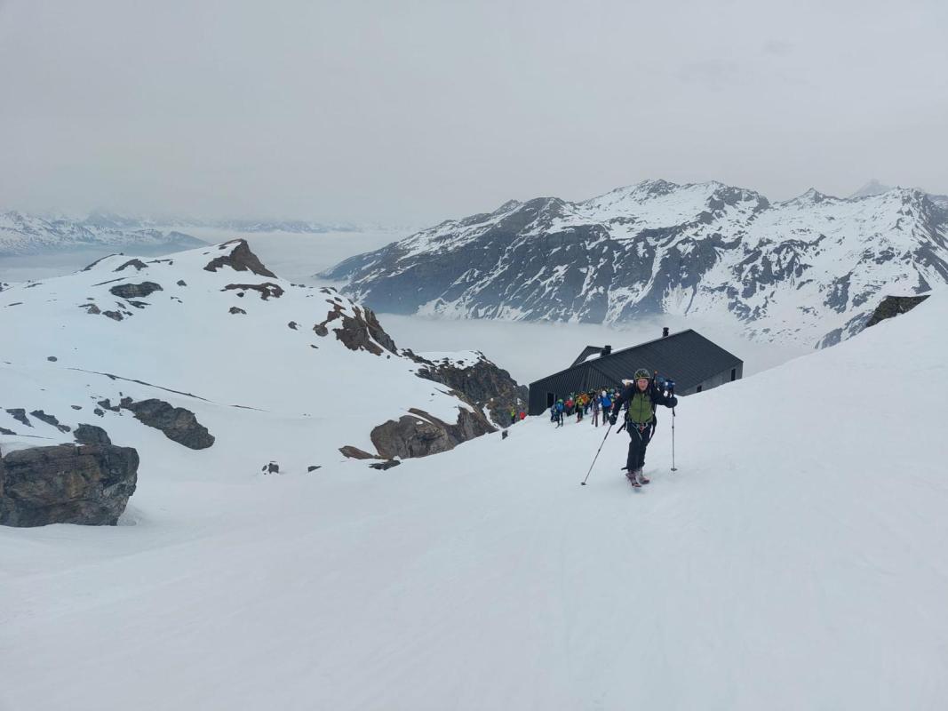 On remonte 100m avec les couteaux sur une neige bien dur pour atteindre un couloir face sud pour accéder à notre itinéraire de retour. C'est un couloir en 3.3 bien dur voir gelé, François se lance dedans en petite godille suivie par le reste du groupe en mode virages, dérapages, escalier, chacun son style! On avait dit ski 3.3 du coup ça c'est fait, félicitation à tous pour cette descente pas évidente dans des conditions assez mauvaise!