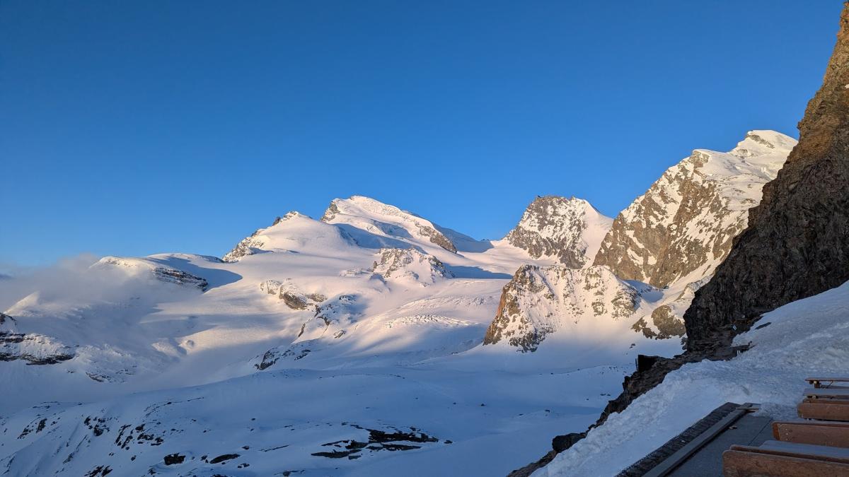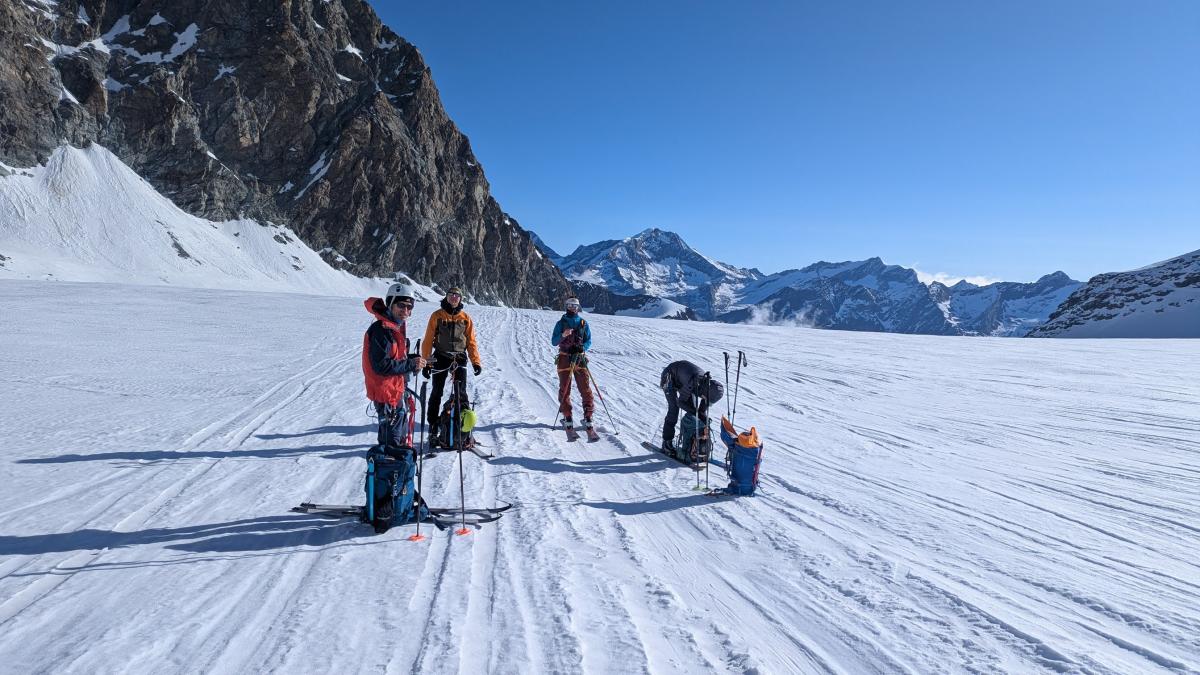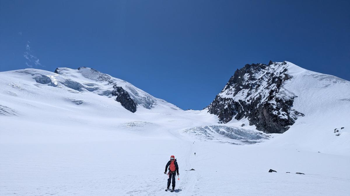 Antoine : Le deuxième jour nous partons en direction de notre deuxième objectif de la semaine, le Strahlhorn qui culmine à près de 4200m d'altitude. Réveil à 6h comme la vieille et nous basculons cette fois de l'autre côté du Brittaniahütte un immense glacier à traverser dans un cadre somptueux ! Le soleil est encore au rendez-vous tout au long de la journée. En arrivant au Adlerpass à 3800m nous avons l'occasion d'avoir pour la première fois du séjour une magnifique vue sur le Cervin ! Nous attaquons ensuite les dernières pentes pour aller au sommet et la fatigue se fait sentir sur les 200 derniers mètres en raison de l'altitude. Nous entamons ensuite notre descente avec un pique-nique sur le glacier avant de rejoindre le Britanniahütte vers 15h-15h30.