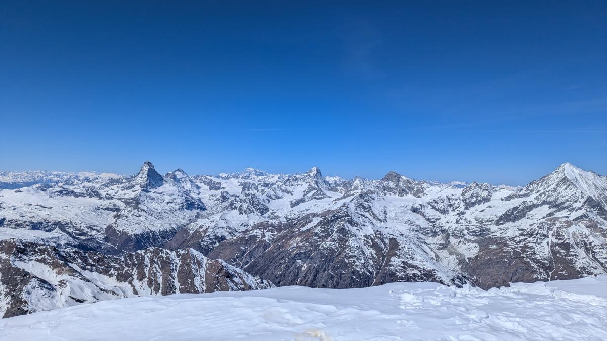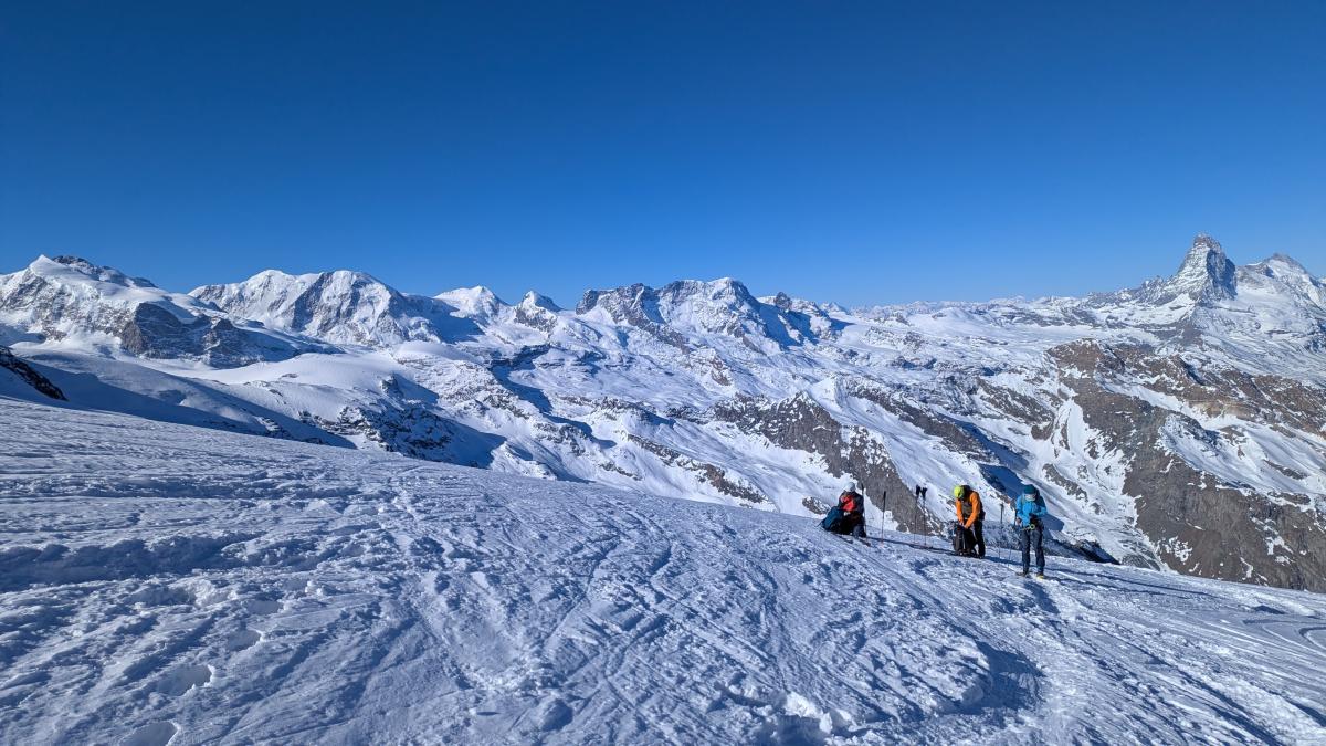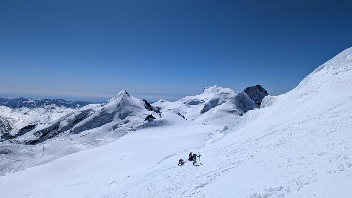 Lucie : Réveil plus matinal ce jour pour attaquer le sommet le plus exigeant de notre raid, mais heureusement le petit déjeuner et notamment le fameux Bergkäse nous tiendront bien au corps. Autour des 6h, on quitte le refuge tout parfait de la Täschhütte dans son écrin de verdure pour remonter les vallons en neige dure jusqu'à retrouver la vue superbe qui est la nôtre depuis 2 jours: le Mont Rose, Cervin, Montblanc Zinalrothorn