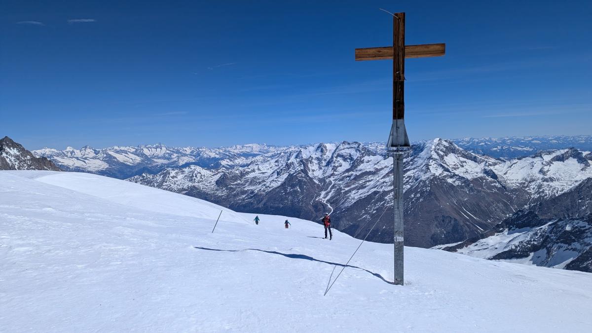 Premier passage raide en crampons avant de rechausser au soleil sous l'Alphubeljoch. Après le col, nous traversons à plat sous le sommet pour attaquer par la pente raide finale en crampons entre les séracs, exercice qui devient bien cardio à 4000m. On rejoint la croix du sommet de l'Alphubel et profitons du soleil et de l'absence exceptionnelle de vent pour déguster notre pique-nique, le luxe ! La redescente de + de 2000m nous fait réviser toute la gamme de type de neige : de dure à trafolée, de croûtée à transformée. Arrivés à Saas Fee, nous retrouvons le parking à travers le dédale de rues en travaux de la station, ce qui nous a paru plus compliqué que d'éviter des crevasses pendant 4 jours.