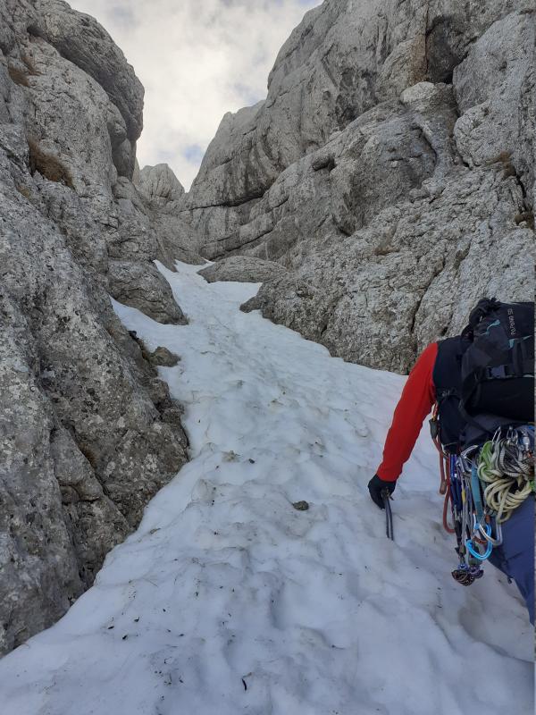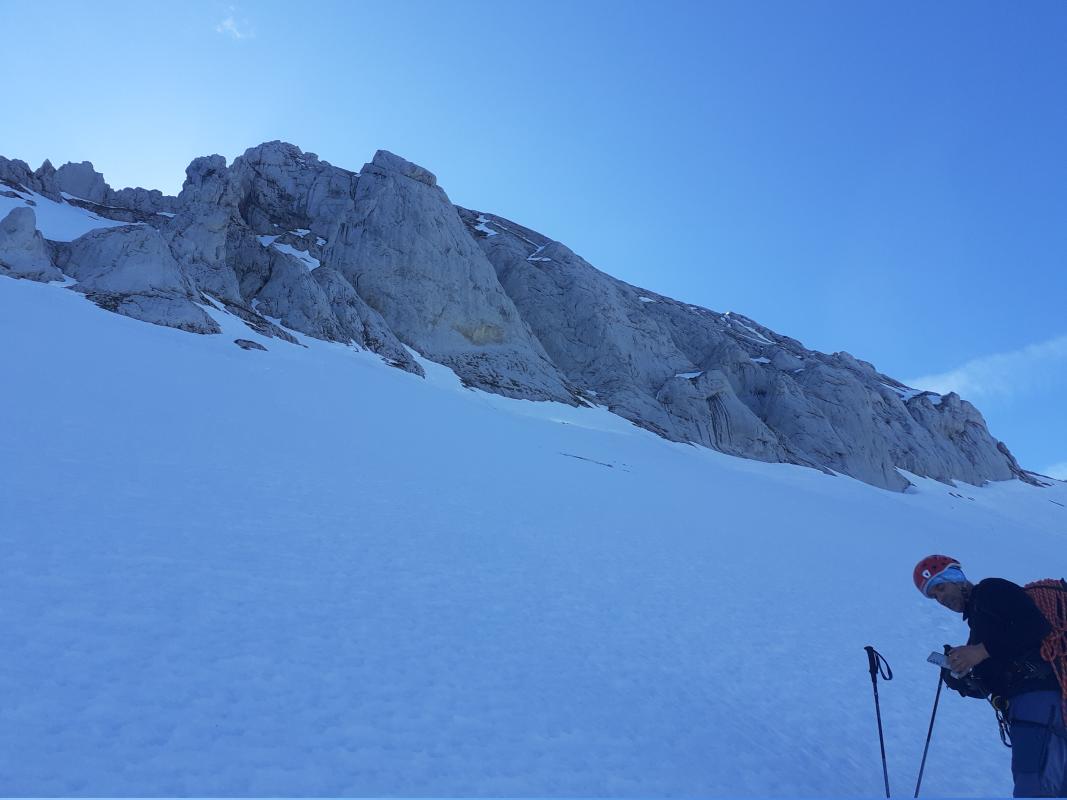 En cette fin de saison, la goulotte est peu remplie, avec une succession de couloirs de neige et ressauts rocheux. Dans ces conditions, le parcours est un peu moins technique.